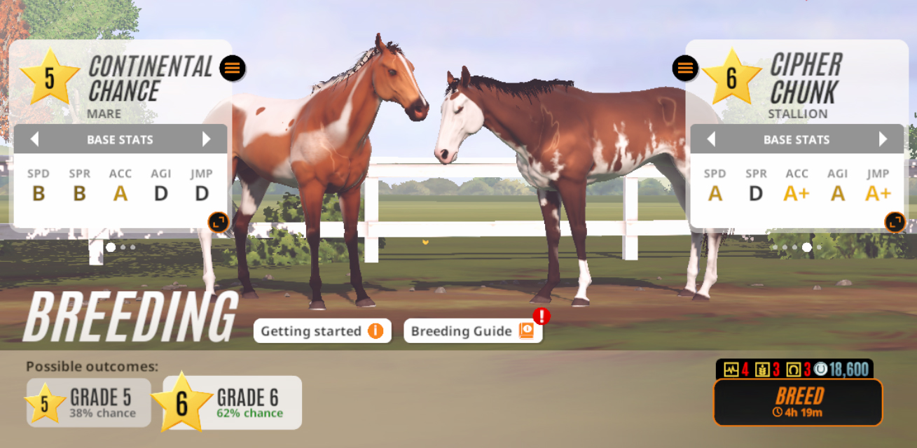 We have also made a change to the way stats are distributed to a foal when it is born. We have reduced the randomness in the calculation of these stats, which means you are now much more likely to get a foal with stats that are the average of its parents.A newborn foal's base stats are most likely to be the average of the parents' individual base stats. For instance, if the mare has A+ Speed and the stud has B Speed, the resulting foal is likely to have A Speed. If a foal is born at a grade higher than its parents, its stats will not be as high as they could be. To breed for the best stat qualities, make sure your foal is born at the same grade as its lowest grade parent. You can use Modify Outcome to ensure this.