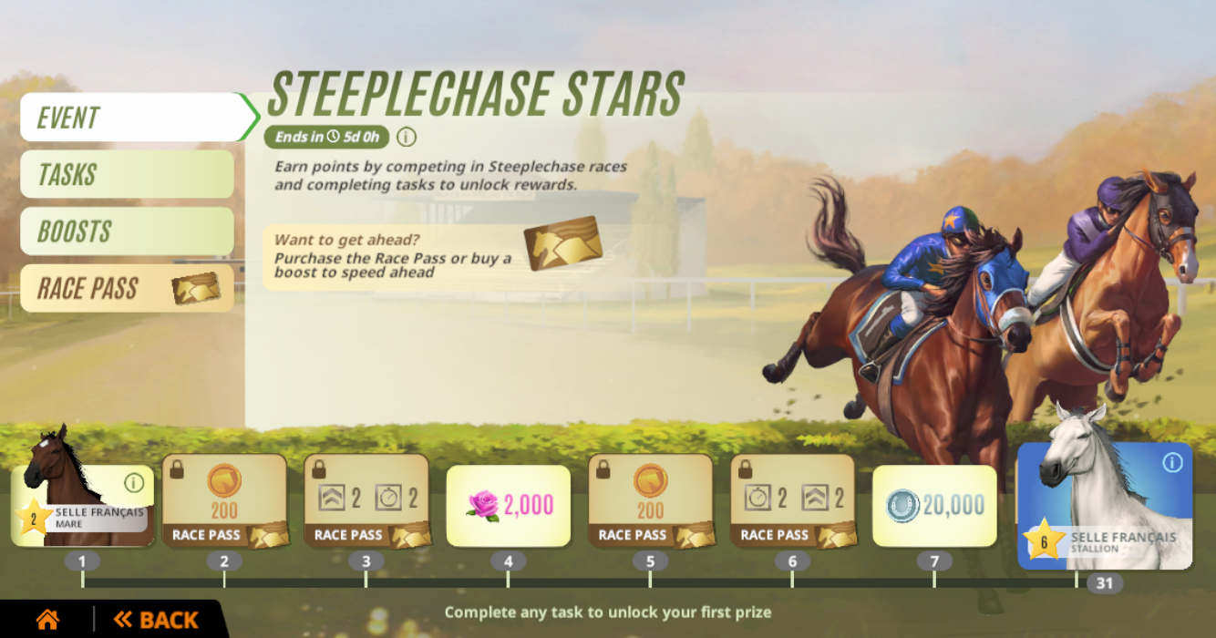 Alongside the free rewards accessible to all participants, you'll also have the opportunity to purchase the incredibly valuable Race Pass. Priced at $5.99 USD, this pass doubles the points you accumulate. This means you'll make rapid progress through Steeplechase Stars and unlock premium rewards that enable you to earn up to 3,000 Gold by completing the event!