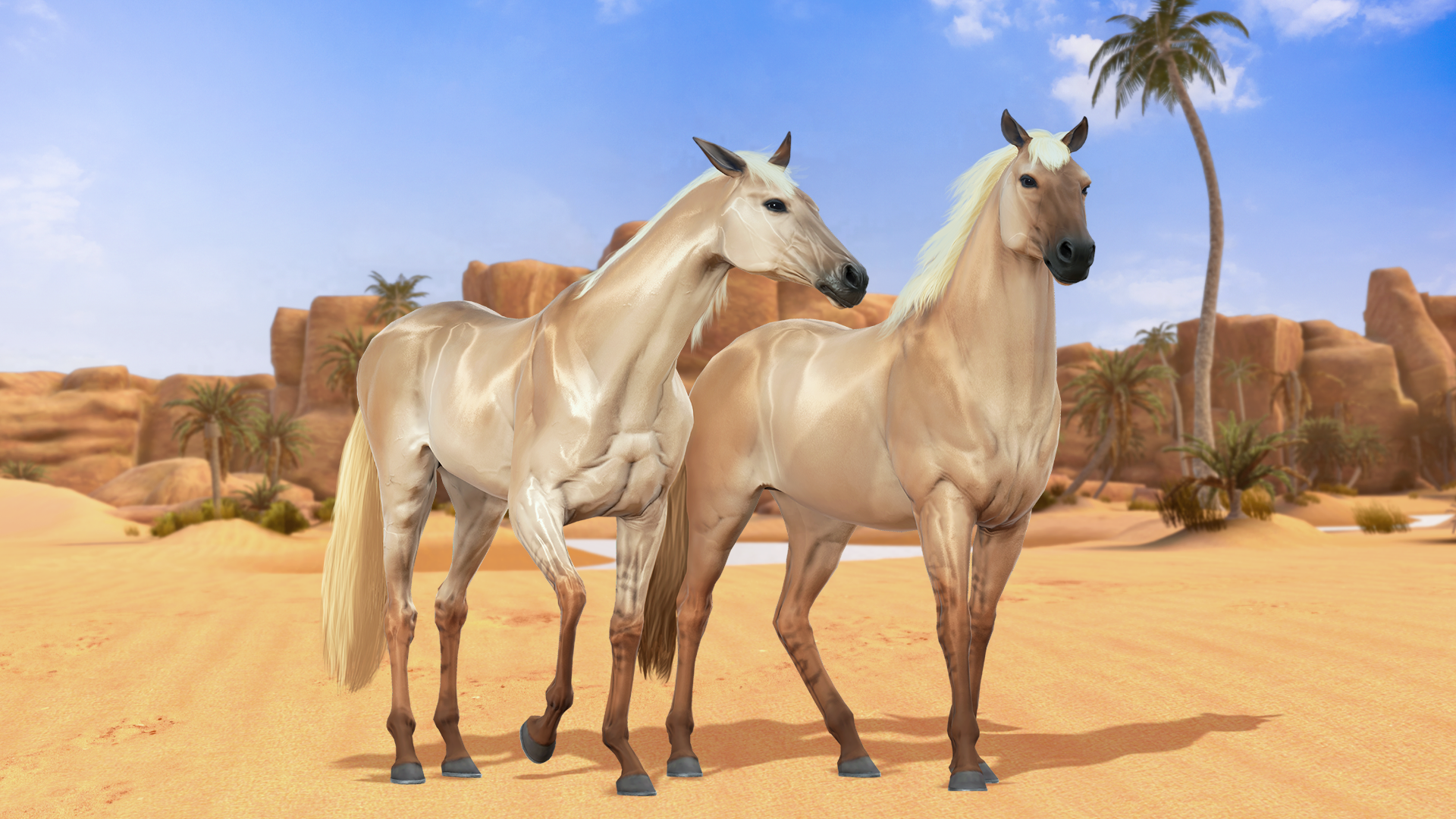Welcome to Golden Dunes, the newest free roam environment exclusively available for Star Club Subscribers! This sun-kissed desert paradise invites you to embark on an unforgettable adventure, perfectly designed for you and your horses—especially the shimmering Akhal-Teke.